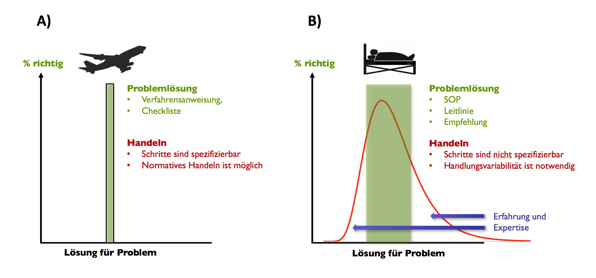 Anders hingegen sieht es in einem biologischen System wie beispielsweise dem Menschen aus (Rechte Seite der Abbildung). Hier kann ein und dasselbe Symptom eine Reihe an Ursachen haben, deren Häufigkeiten einer nicht-normalen Verteilung folgen (rote Kurve). Ein Beispiel hierfür wäre der plötzliche Sättigungsabfalls. Für diese pathophysiologische Störung kann ein Erwartungshorizont an Ursachen und den resultierenden Maßnahmen definiert werden, die bei der Mehrheit der Patienten (i.e. der „Durchschnittspatient“) zu einer Problemlösung führt (grüne Fläche). Dieser Erwartungshorizont ist variabler als der Lösungsbereich für ein technisches Problem und erfaßt nicht alle denkbaren Möglichkeiten. Für das therapeutische Vorgehen innerhalb dieses Erwartungshorizonts können Empfehlungen oder ‚Leit-Linien’ vorgegeben werden. Jedoch sind sowohl für deren Anwendung als auch für Patienten außerhalb des Erwartungshorizontes klinische Erfahrung und Expertise notwendig. Somit ist für Notfälle in der Medizin weder eine verbindliche Vorgabe einer einzigen Lösung noch die Behandlung mittels linearer Checkliste möglich.