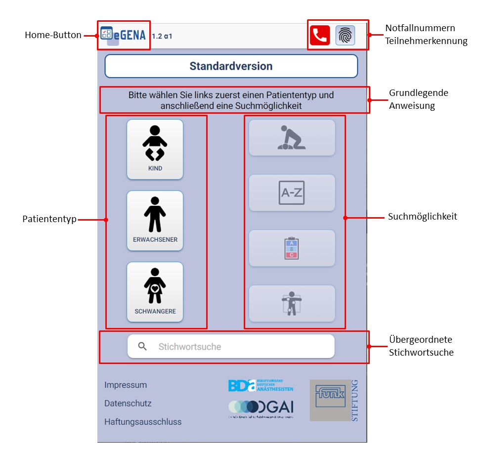 Abbildung 2: Aufbau der Startseite der Smartphone-Variante. Die Auswahl eines Notfalls erfolgt immer über die Anwahl eines Patiententypen gefolgt von einer der vier Suchoptionen. Solange kein Patiententyp angewählt wurde sind die folgenden Wahlmöglichkeiten (Reanimation, alphabetische Suche, ABCDE-Schema, Körpernavigator) ausgegraut. Eine Stichwortsuche ist unabhängig von der Vorauswahl einer Patientengruppe möglich.