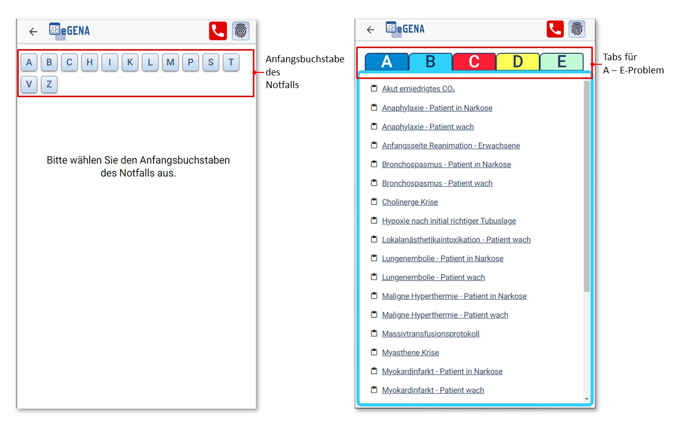 Wird eGENA das nächste Mal vom Homebildschirm aus gestartet, sind die browsertypischen grafischen Elemente nicht mehr sichtbar und eGENA wirkt optisch wie ein eigenständiges Programm. Bei jedem weiteren Start überprüft eGENA, ob eine Online-Verbindung verfügbar ist. Ist dies der Fall, wird im Hintergrund nach Aktualisierungen gesucht. Ist das Gerät hingegen offline (z.B. im OP), wird mit den gespeicherten Daten gearbeitet.