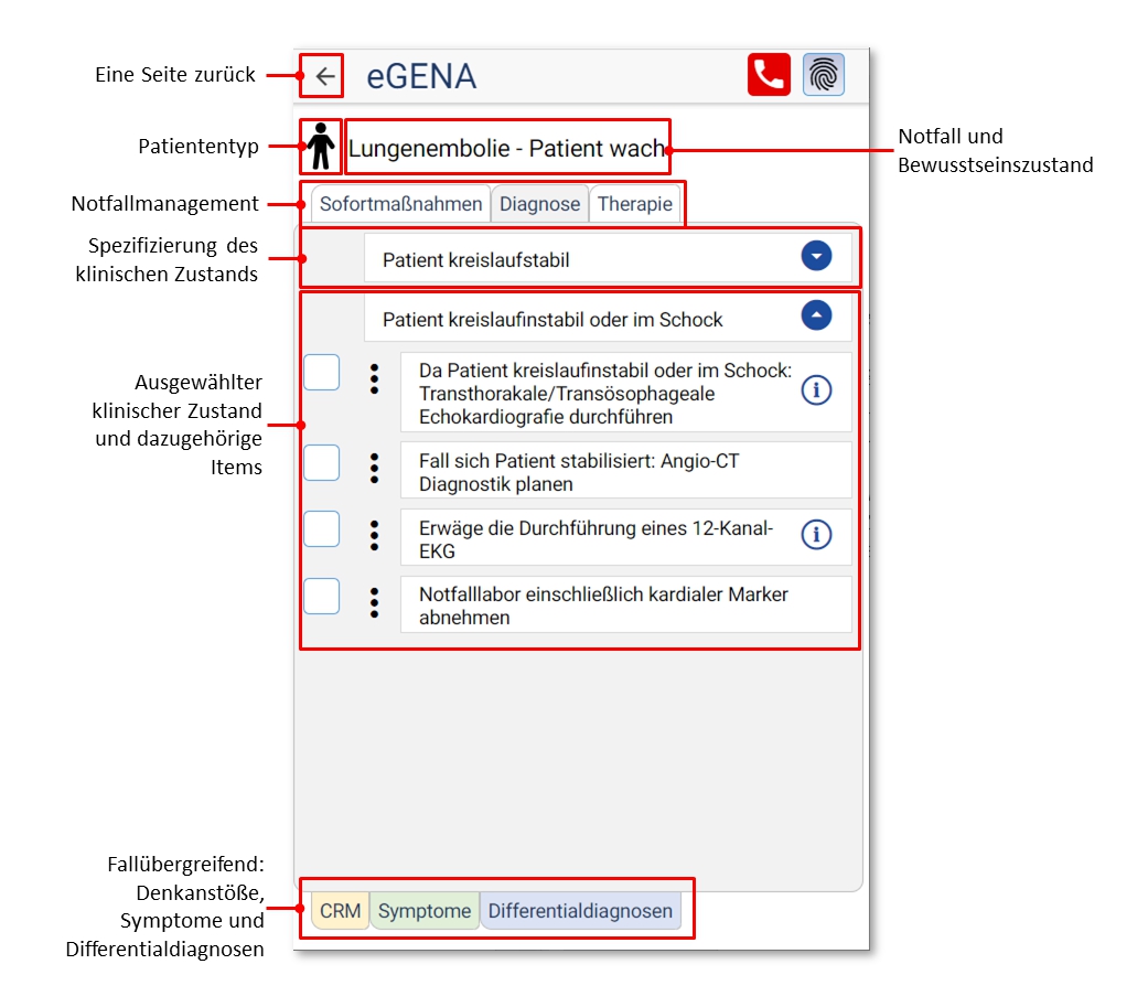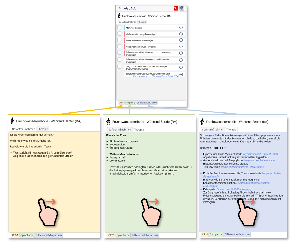 Abbildung 5: Fallübergreifende Kartenreiter mit CRM-Denkanstößen, Symptomen und Differentialdiagnosen. Bei Anwahl öffnet sich eine neue Seite. Die CRM-Impulse unterscheiden sich abhängig davon, ob zum Zeitpunkt der Anwahl „Sofortmaßnahmen“, „Diagnose“ oder „Therapie“ geöffnet ist. Die Zusatzinformation kann entweder a) Anwahl eines der Kartenreiter für Sofortmaßnahmen, Diagnose, Therapie, b) durch Swipen nach rechts (zurück zur Startseite) oder c) durch Betätigen des ‚Zurück‘-Pfeils geschlossen werden. Existiert für eine Differentialdiagnose in eGENA eine entsprechende Seite, so ist diese verlinkt und anhand der blauen, kursivgestellten Schrift zu erkennen. Eine Betätigung des Links führt zum Aufruf der Seite des gewählten Notfalls