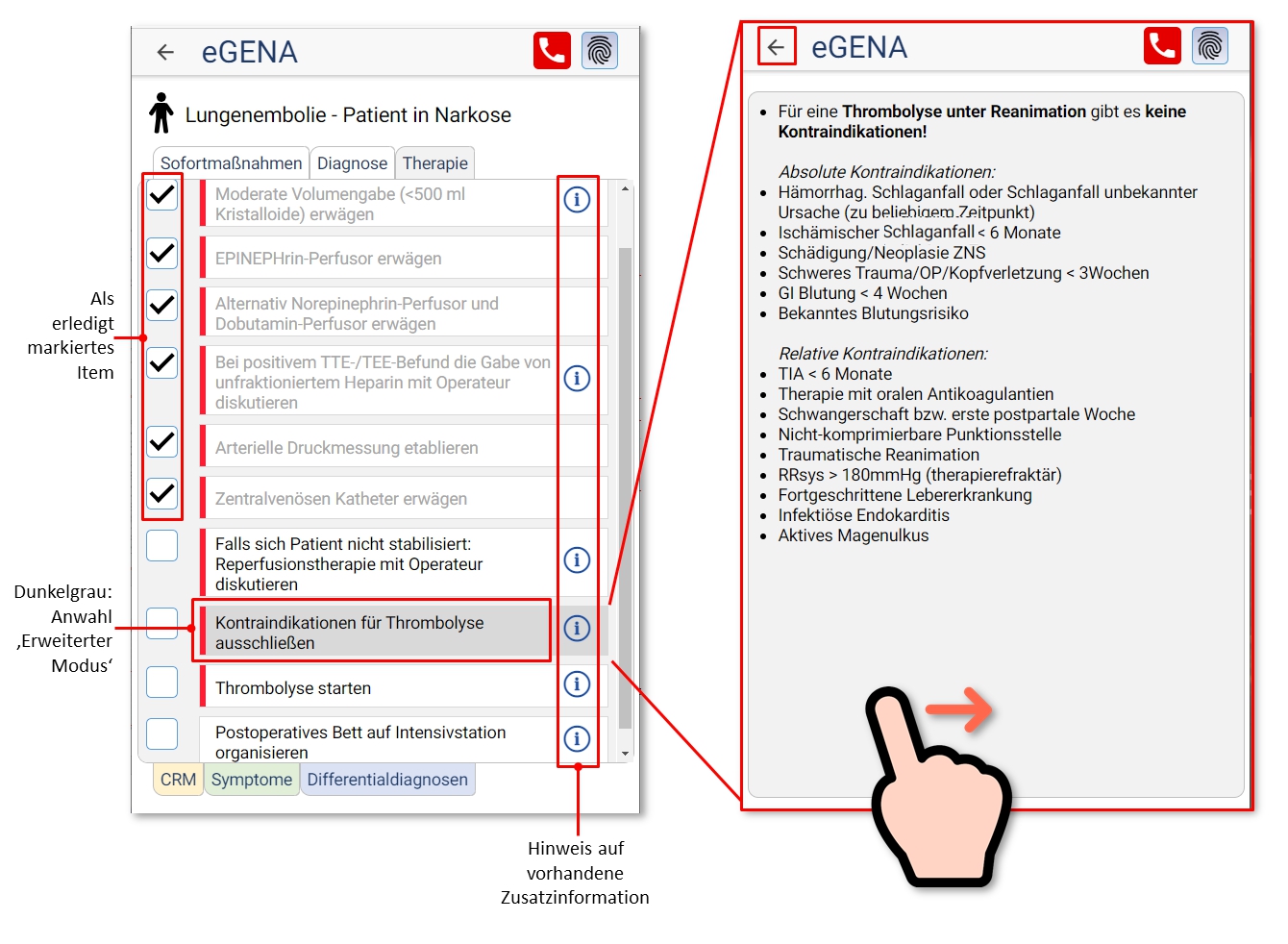 Abbildung 6: Kartenreiter der Therapie eines Notfalls (hier: Lungenembolie beim Patienten in Narkose). Farbig markierte Zeilenanfänge zeigen dem Anwender an, welches der ABCDE-Probleme er mit der gewählten Maßnahme adressiert. Mit Abhaken der Checkbox vor einer Zeile wird das entsprechende Item mit einem Häkchen als erledigt markiert und wird ausgegraut dargestellt. Zusatzinformation wird über Anwahl des i am rechten Ende der Zeile aufgerufen. Die Textzeile mit dem Item zu der angewählten Zusatzinformation ist mit einem dunklen Grauton kenntlich gemacht. Bei Anwahl öffnet sich eine neue Seite. Die Zusatzinformation kann entweder durch Swipen nach rechts oder durch Betätigen des ‚Zurück‘-Pfeils (oben links) geschlossen werden.
