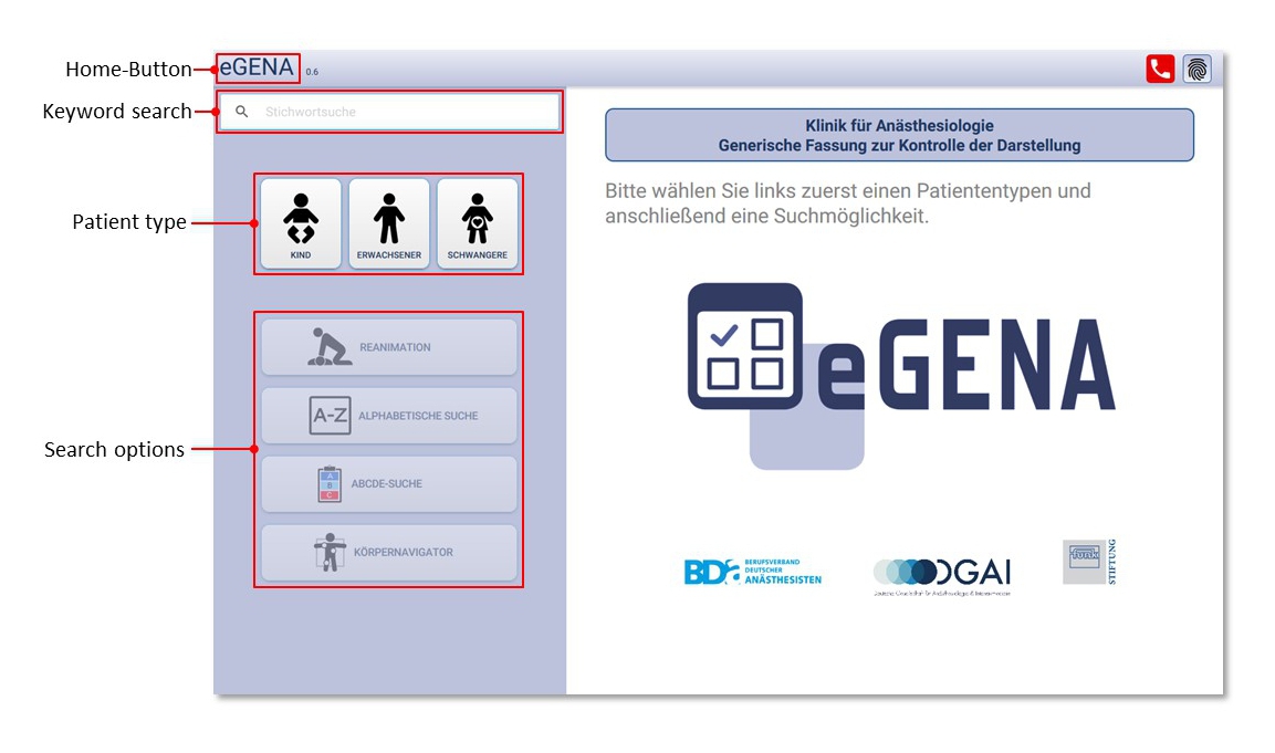eGENA is a progressive-web-application which stores information offline on stationary and mobile devices. At present, a German language version of eGENA can be downloaded for free from this website or from the website of the German Society of Anaesthesiology and Intensive Care. Both websites offer comprehensive training material aimed at supporting local teams in their efforts to implement eGENA at their department.