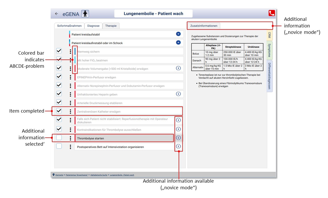 Figure 6: Treatment for an awake, hemodynamically instable patient with the suspected diagnosis of pulmonary embolism. On the right the tab with additional information regarding dosage of thrombolytic agents has been selected.