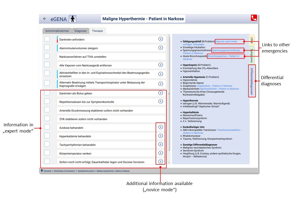 To date, eGENA comprises more than 50 emergencies including those listed in the Helsinki declaration of patient safety in anaesthesiology for which institutional protocols are recommended. In addition, eGENA supports non-technical skills by providing CRM-impulses for decision making, teamwork and resource management.
